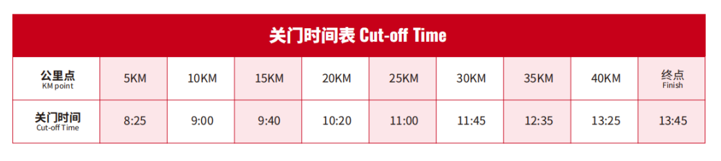 为了保证运动员赛时安全,比赛路线将按公里点位置设置分段关门时间,分路段、分时对社会交通进行临时管制。关门时间按自然时间计算,到达关门时间后,相应公里点的计时毯停止工作,相应路段将恢复社会交通。未跑到相应公里点的运动员须退出赛道,以免发生危险。退出赛道的运动员可到路线沿途就近的收容站搭乘收容车,或自行选乘公共交通前往终点取衣。