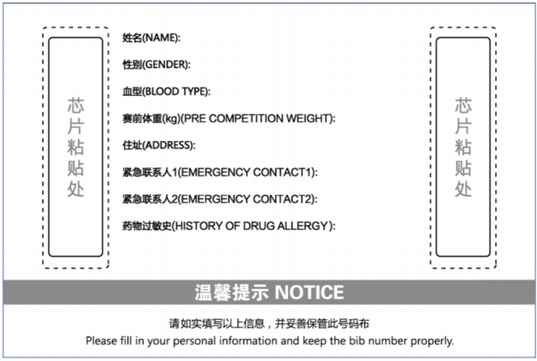 请运动员将赛事小号码布粘贴在盛衣袋指定位置,号码朝外。起点存衣截至 7:15,请选手注意,安排好时间。